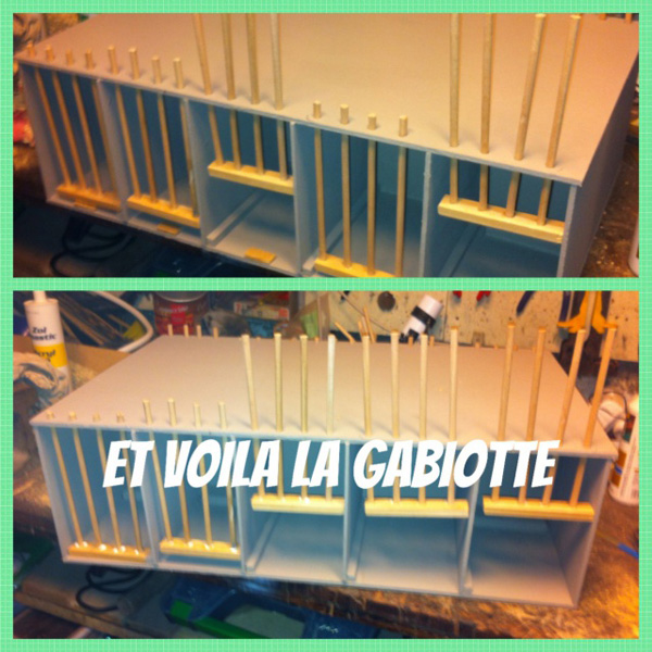 Les portes sont faites avec des tourillons des 5 que jai collé sur la barre de bois que vous voyez en bas de la caisse.