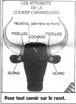 bon alors je vais commencer un peut a expliquer le but de la course camarguaise qui oppose un homme vêtue de blanc appelle ( raseteur ) et d une bette le taureau le BIOU donc le but du raseteur qui et équiper d un crochet doit levée des attribue donc dans l ordre ( cocarde / gland / puis ficelle ) qui sont plus ou moins primer en argent par le président de coursephoto d un crochet